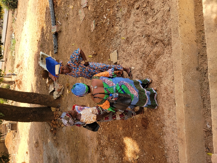 The image depicts an outdoor scene in Ebenebe, Nigeria, featuring three adult women conversing on a sandy-dirt ground under bright sunlight
