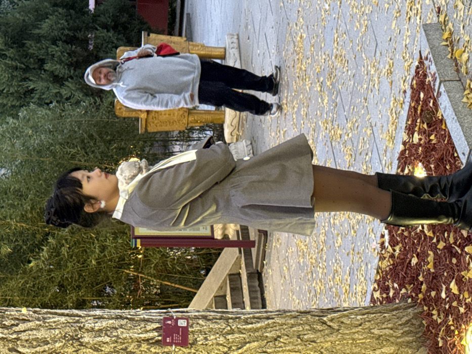 The image depicts an outdoor public space, likely a park or temple grounds, within Xicheng District, China, characterized by traditional architectural elements and autumn foliage. In the foreground, slightly left of center, a young East Asian female stands in profile, facing right. She has dark hair styled in an updo and wears white circular earrings. Her attire consists of a grey, long-sleeved coat-dress extending to mid-thigh, a white collar or scarf element, black opaque tights, and black knee-high boots. Her hands are clasped in front of her. To her immediate left is the trunk of a light-barked tree, bearing a small red rectangular sign with white text and a QR code. The ground around the tree's base features reddish-brown mulch. In the midground, to the right and behind the female, an adult male stands facing generally towards the foreground. He has a beard and mustache and wears a grey hooded sweatshirt with the hood up, dark pants, and athletic shoes. A red shoulder bag is slung across his left side. The ground consists of grey paved stone, scattered with numerous yellow leaves, indicative of autumn. In the background, green bamboo-like plants and evergreen trees are visible. Behind the female, stone steps ascend to a higher platform with dark red architectural elements. Behind the male, two large, ornate golden structures, possibly decorative pillars or urns, are present. The lighting suggests late afternoon or an overcast day, with some artificial ambient lighting noticeable in the foliage.