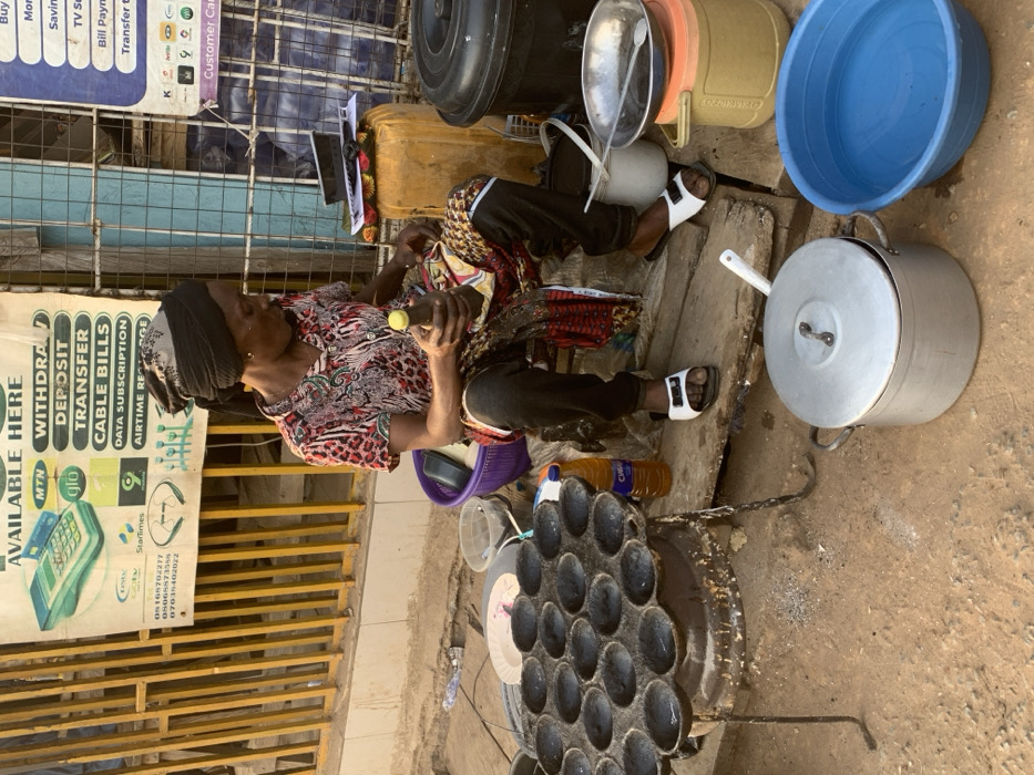 A woman sits preparing street food, likely "Puff-puff," using a specialized pan with multiple hemispherical molds over a stove. Various cooking utensils, including pots and bowls, surround her. She's situated beside a metal structure, with a sign promoting mobile banking services, like withdrawals, deposits, and data subscriptions.