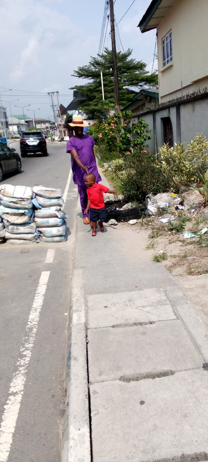 The image depicts a man in a purple shirt and a hat leading a young child in a red shirt down a sidewalk. The sidewalk is adjacent to a road with a white line painted down the middle. The sidewalk is bordered by a concrete curb. There are multiple bags of cement stacked in a pile next to the curb. To the right of the sidewalk, the ground is covered in gravel and some vegetation. A building with a white facade and a window is visible to the right of the scene. The building has a chain link fence in front of it. The image appears to have been taken in Port Harcourt, Nigeria. The coordinates 4.825, 7.009 are in the city of Port Harcourt, Nigeria.