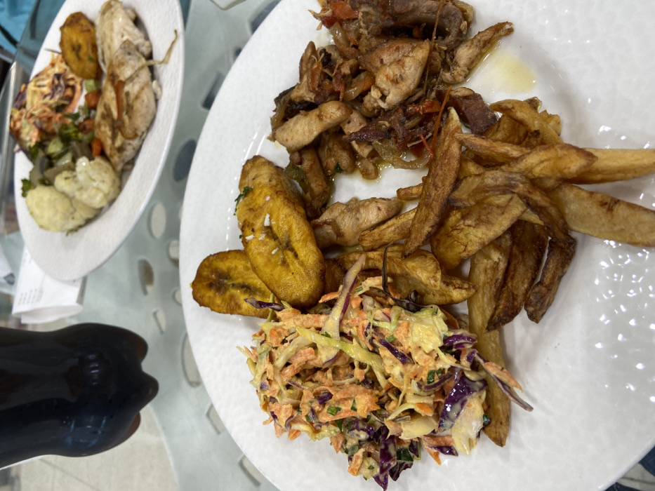 The image presents a dining scene with two plates of food and a beverage on a patterned, light-colored table within an indoor setting, identified as being in the city of Juan Griego, Venezuela. The prominent foreground plate, white and oval, contains a meal comprised of several distinct components. A mound of coleslaw, made from shredded white and red cabbage, carrots, and a creamy dressing, is situated on the left. Adjacent are multiple golden-brown slices of fried ripe plantain. Below these, a pile of irregularly cut, golden-brown fried potato pieces is visible. To the right, a portion of sautéed chicken pieces is mixed with onions and possibly other vegetables like red bell peppers, coated in a light sauce. A second white plate, partially out of focus in the background, holds another meal. This plate features two grilled chicken fillets, complemented by steamed cauliflower florets, mixed sautéed vegetables, coleslaw, and a single fried plantain slice. A dark brown plastic bottle, containing a dark carbonated drink, is positioned behind the foreground plate. The table surface is light-colored, possibly glass, and exhibits a geometric pattern of perforations. No individuals or active consumption are depicted.