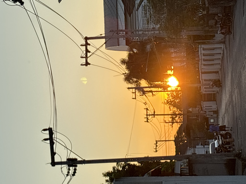 The scene depicts a street in Chiang Rai City Municipality, Thailand, at either sunrise or sunset. The sky is a clear gradient of light orange and yellow, with the sun visible as an intense, overexposed orange orb positioned in the mid-right, partially obscured by trees and utility poles. A translucent, semicircular lens flare artifact is present in the upper center-left sky. Dominant features include numerous dark utility poles with multiple cross arms and insulators, supporting a dense network of black overhead electrical and communication wires that crisscross the upper portion of the frame. On the far left, a light-colored building segment frames the view. A paved street, appearing dark due to backlighting, recedes into the background, curving slightly. On the left side of the street, a white sedan is parked, facing right, with two dark motorcycles parked alongside it. One individual, wearing a dark blue shirt and shorts, walks away from the camera on the left side of the street, towards the background. A second, less distinct individual is visible near the parked motorcycles. Along the right side of the street, a series of uniform, light-colored fence posts or pillars define a property boundary. Further in the background on the right, additional dark motorcycles are parked. Beyond these, structures with dark roofs and walls are visible, including a prominent building with a light-colored, curved roof in the upper right background. Trees with dark foliage are interspersed throughout the scene, silhouetted against the bright sky.