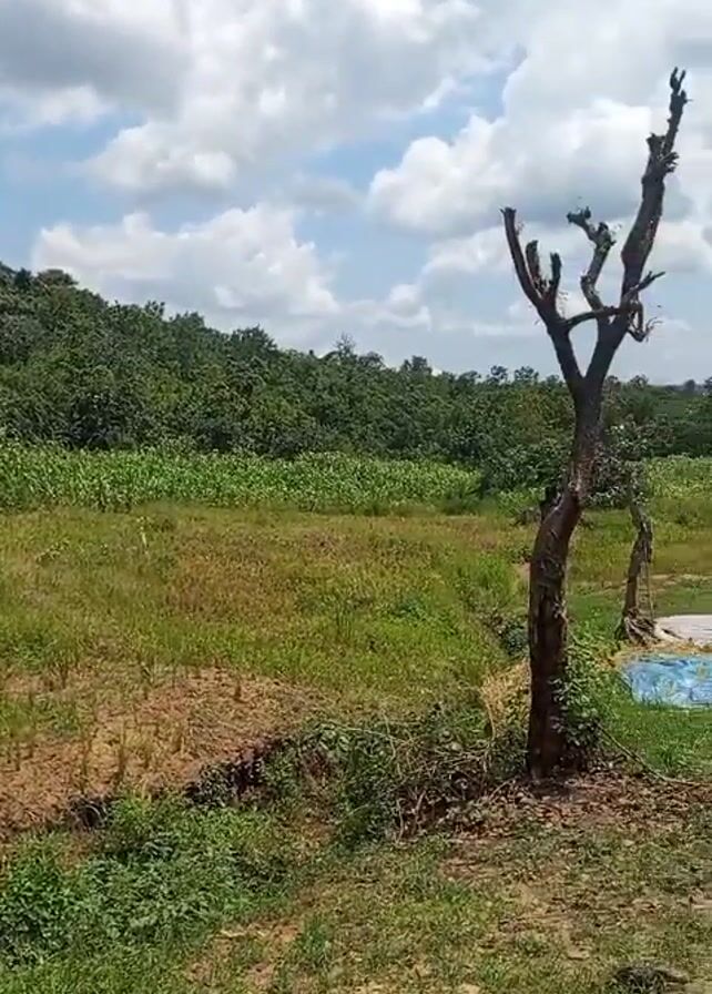 rural landscape on a partly cloudy day. The foreground features a field with patches of dry grass and exposed soil. A bare tree with pruned branches stands in the middle ground. Behind the tree, a person is working in the field, spreading hay or straw on a blue tarp. The background includes lush green vegetation, possibly cornfields, and a distant mountain range on the horizon. The camera pans from left to right, providing a view of the surrounding environment.