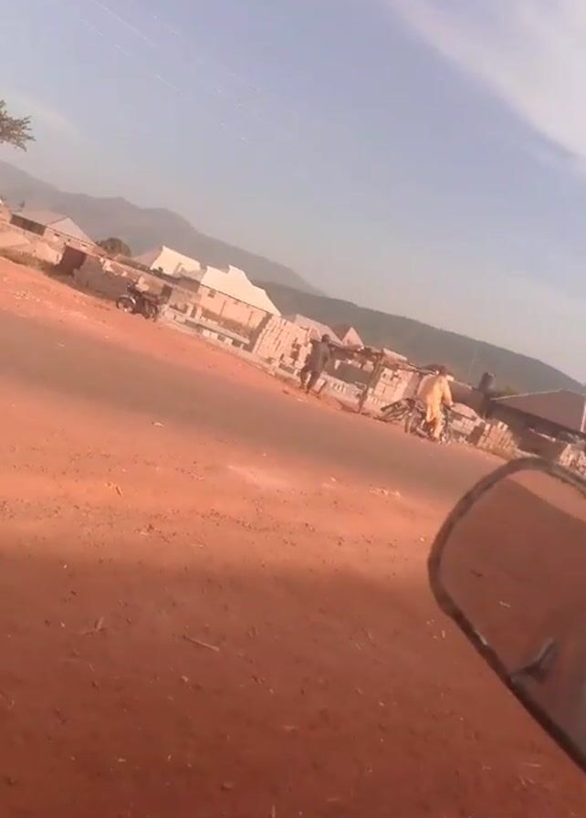 rural scene with a dirt road. There are buildings on the side of the road and mountains in the distance under a blue sky with light clouds. There are two people riding a motorcycle on the road. The person in the back is carrying a green bucket. Other motorcycles and people can be seen in the background. The foreground is dominated by reddish-brown dirt.