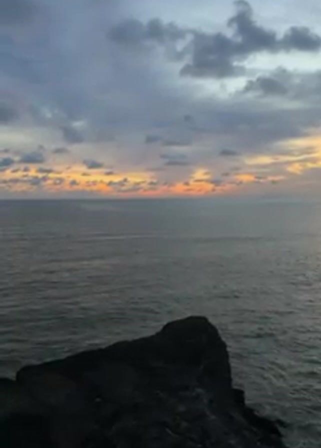 n ocean horizon with clouds lit by the setting sun. In the foreground, there is a dark, rocky cliff and some green foliage in the lower right corner of the frame. The sky is cloudy, and the clouds are dark with streaks of orange and yellow where the sun is setting on the horizon. The ocean water is gray, and some ripples are visible on the surface. The camera is static, providing a stable view of the scene.