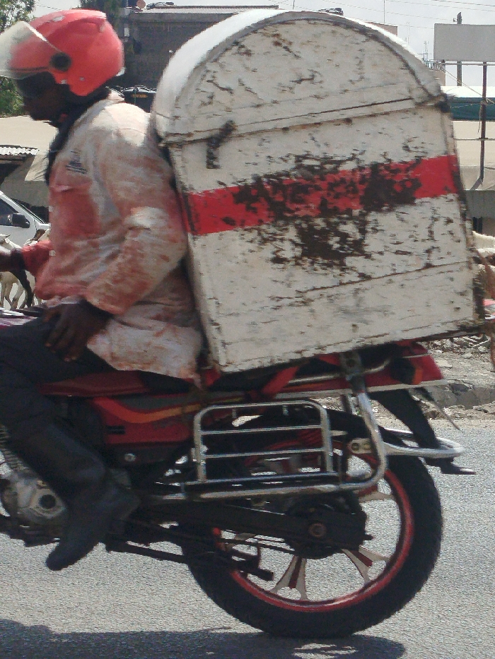 A person wearing a red helmet and a blood-stained shirt rides a red motorcycle. The motorcycle has a large, weathered white box with a red stripe attached to the back. The box appears to be a delivery container. The motorcycle's rear wheel has a red stripe and white details. The scene appears to be on a road with other vehicles and buildings visible in the background.