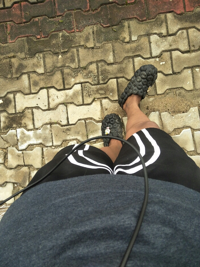 The image displays a downward-facing, first-person perspective of a person's lower body, situated on a paved surface in Iranla, Nigeria. The individual wears dark blue or grey fabric covering the upper lap/thigh area, suggesting a shirt or another garment. Below this, they wear black shorts featuring two prominent, curved white stripes on the outer thigh of each leg. The subject's bare legs extend into black, textured slip-on sandals, characterized by a pattern of small, rounded protrusions. The left sandal exhibits a small white and yellow decorative element near the toe strap. A black cable, likely from headphones or earbuds, runs diagonally across the person's lap and between their legs. The ground consists of interlocking concrete pavers in shades of grey, tan, and reddish-brown, showing signs of dirt, sand, and sparse green vegetation in the crevices.