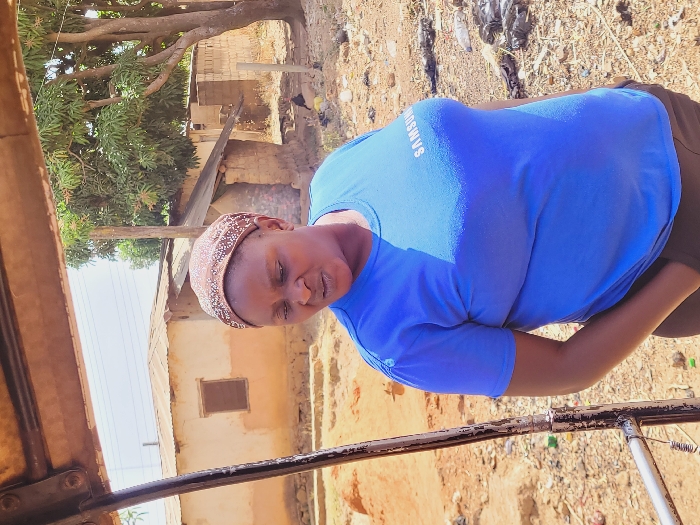 An outdoor, eye-level, medium shot depicts an adult female in what appears to be a residential area in Udu, Nigeria