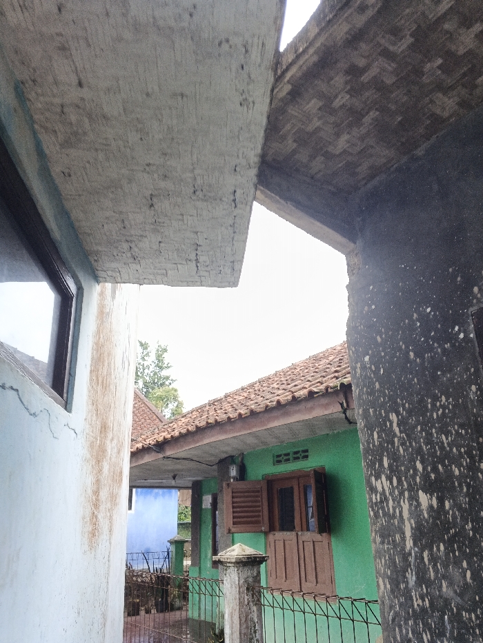 The image depicts a narrow view between two structures in Pinnwe, Myanmar (Burma), looking towards several residential buildings under an overcast sky. In the foreground left, a pale blue wall exhibits vertical brown staining and a horizontal crack. A dark-framed window with a light reflection is partially visible on this wall. Directly above, a light grey concrete overhang with a textured, wood-grain pattern is seen. To the foreground right, a dark, possibly charcoal-colored, heavily textured pillar or wall section is covered with numerous irregular light-colored splatters. Above this, a darker concrete overhang displays a woven basket-like pattern. Beyond this narrow passage, a vibrant green house with a traditional reddish-brown tiled roof is centrally positioned. This house features a wooden window with open brown shutters and a narrow vent strip above it. Below the window, a light green metal fence with diamond-shaped mesh is visible, supported by two concrete posts with pyramidal caps. Further in the background, to the left of the green house, a portion of another building painted a distinct blue is visible. Scattered green tree foliage is evident above and between the structures against the uniformly light, featureless sky. No individuals or specific actions are discernible within the frame.