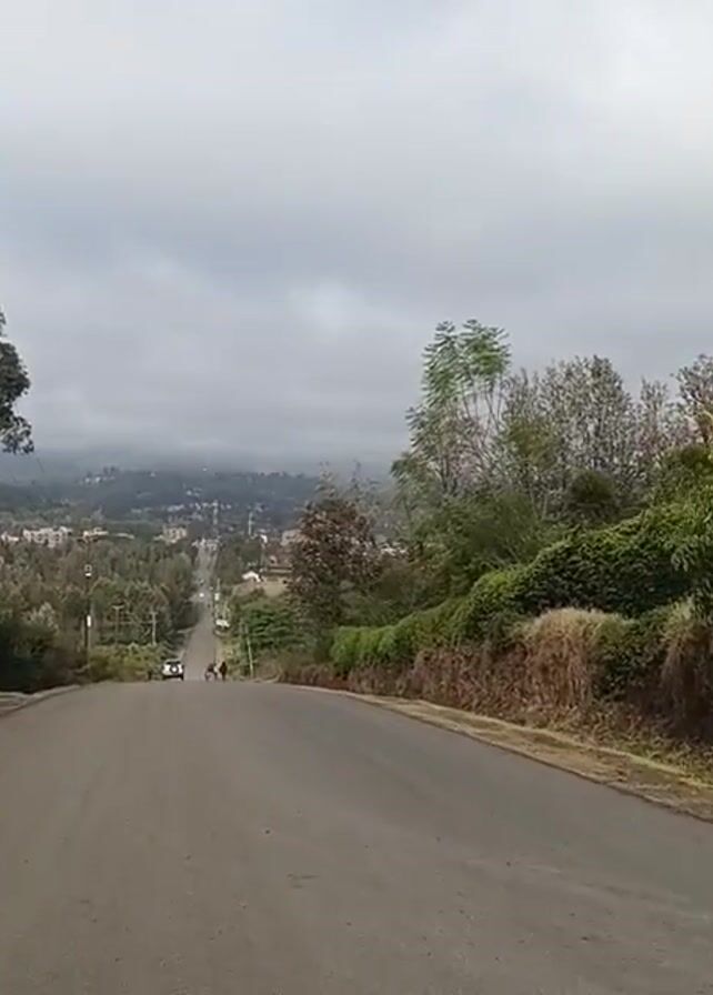 The camera pans down a paved road in what appears to be a mountainous region. The day is overcast with a thick cloud cover. The road descends into a valley with a visible town in the distance. Green vegetation lines the side of the road, and a few people are walking down the street. There are also several vehicles in the distance on the road.