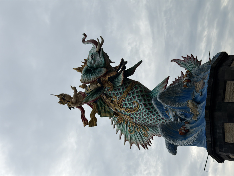 A low-angle view captures a statue against a cloudy sky. The statue features a figure riding a large fish-like creature with an elephant-like head, complete with tusks. The fish body is decorated with scales, and the base depicts waves with various fish and turtles. The statue is intricately detailed and appears to be part of a building structure.