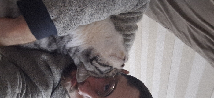 A person with glasses and dark hair is lying down, face visible. A tabby cat rests its head on the person's forehead and neck. The person is wearing a grey sweater, with a dark blue collar on the sleeve. The cat is light grey with darker tabby markings. The background includes a striped, possibly corduroy, material and a plain grey fabric. The scene appears to be indoors and intimate.