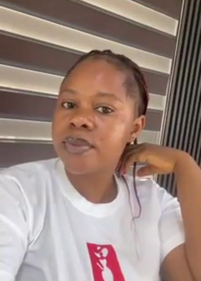 A medium shot depicts a woman with dark skin, brown eyes, and small red-brown braids partially pulled back. She wears a white t-shirt with a red design of a female figure. Her left hand rests on her right shoulder, and her right hand touches a braid near her right ear. The background features a window with closed horizontal blinds. The blinds have a light brown color with dark brown stripes between each slat. To the right of the window, a vertical black strip is visible, possibly part of a frame or architectural element. The woman looks directly at the camera and appears to be talking, although no audio is provided.
