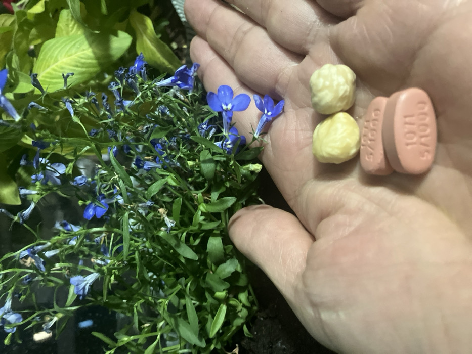 A close-up image displays a light-skinned human hand, palm-up, positioned beneath a vibrant cluster of green foliage adorned with numerous small, blue flowers, likely Lobelia. In the palm, two light-colored, irregular, peeled nuts are visible. Below these, two oblong, peach-colored pills are stacked. Each pill is embossed with "1071" on the top line and "S/1000" on the line beneath it. A few detached blue flower blossoms rest on the palm near the nuts. Additional green and yellow foliage is partially visible in the upper right background. The environment behind the plants is dark and indistinct. The image provides no visual indicators to confirm a specific location in Givatayim, Israel.