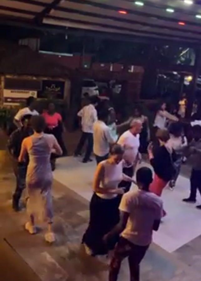 group of people dancing on an outdoor dance floor at night. Most of the dancers are in pairs, moving to the music. There appears to be a restaurant in the background with a wooden facade. The dance floor is tiled and has a few steps leading up to it. Overhead, there's a covered patio area with string lights. The people vary in age and ethnicity. They appear to be enjoying themselves.