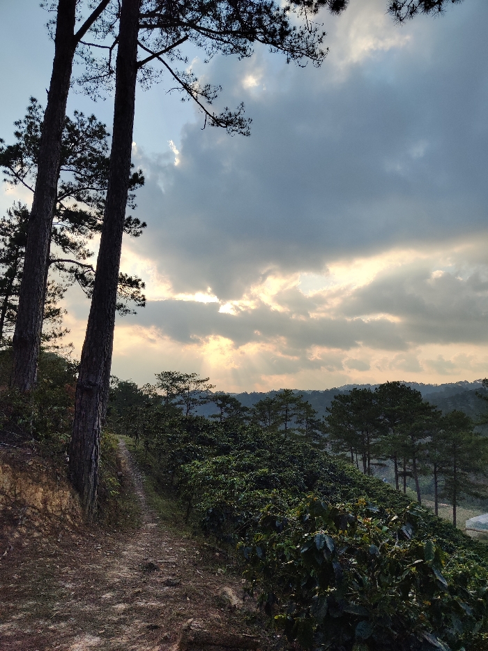 The image depicts a rural landscape in Lạc Dương, Vietnam. In the left foreground, two tall, dark-barked pine trees stand on a reddish-brown dirt embankment. A narrow, unpaved dirt path ascends from the lower-center, curving slightly uphill. To the immediate right of the path, a dense field of dark green, leafy shrubs, consistent with a coffee or tea plantation, covers the slope. Further back, rolling hills are visible, densely covered with pine trees. The upper half of the frame is dominated by a cloudy sky, featuring dark grey and blue-grey clouds. Bright yellow and orange light from a low sun penetrates through openings in the clouds, creating visible sunbeams and illuminating parts of the sky. No people, distinct man-made objects, or specific actions are visible within the scene.
