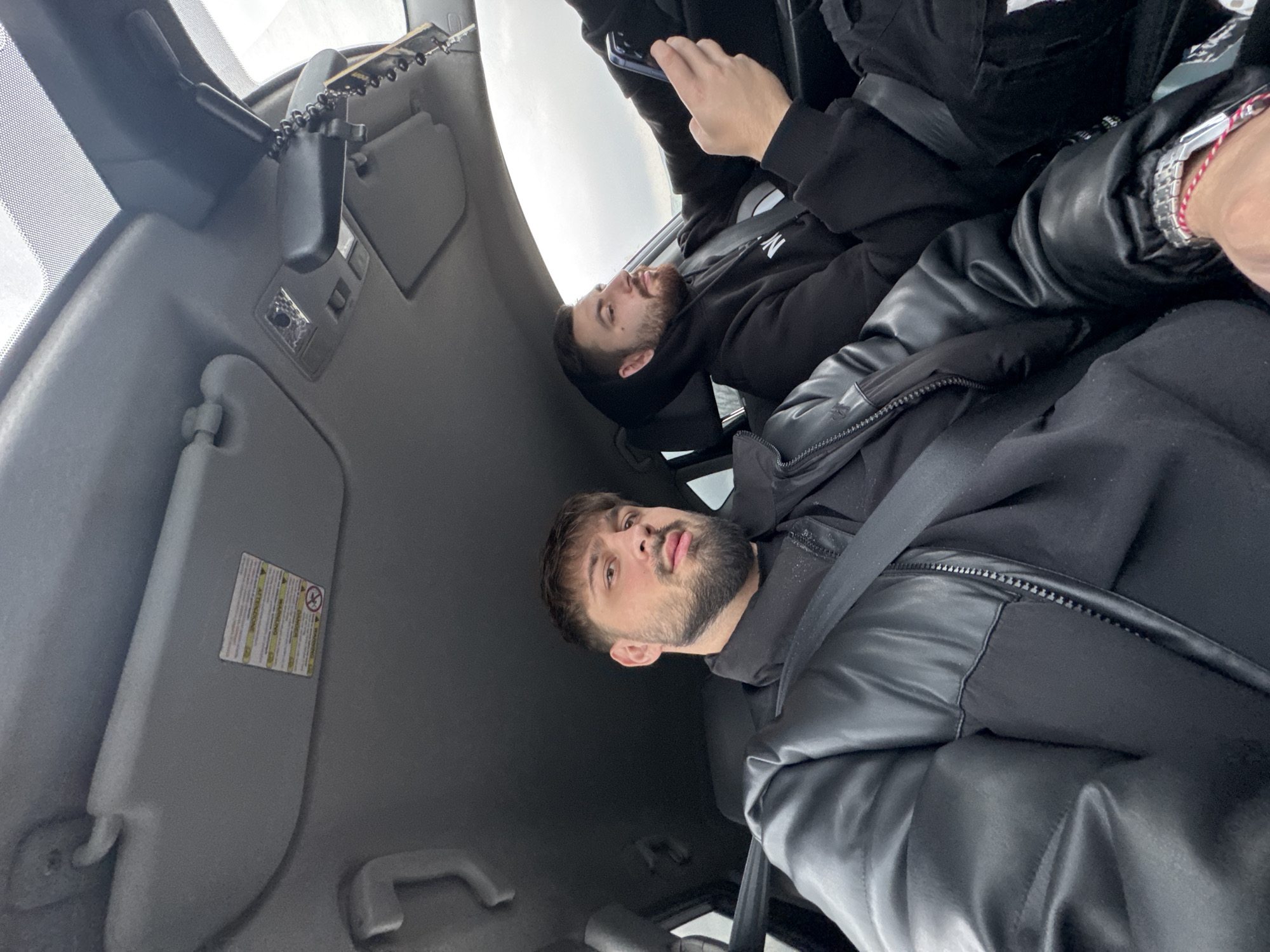 The image depicts the interior of a vehicle's front cabin, located in Venchan, Bulgaria. Two adult males are present. The individual in the front passenger seat, positioned in the foreground, has dark hair and a full beard. He is wearing a black puffer jacket over a dark garment and is secured by a black seatbelt across his chest. On his left wrist, he wears a metallic watch with a link bracelet and a red-and-white braided bracelet, consistent with a martenitsa. He is looking directly towards the camera, indicating he is likely capturing the image. The individual in the driver's seat, visible in the background, also has dark hair and a beard. He is wearing a black hooded sweatshirt with a white "The North Face" logo on the left chest and is secured by a black seatbelt. His right hand holds a dark-colored smartphone, which he is observing. The vehicle's interior features a grey overhead console with a light fixture and switches. Two sun visors are visible; the driver's side visor displays multiple yellow-and-white warning labels with black text and symbols. A black rearview mirror is centrally mounted, from which hangs a string of black beads, a small cross, and a rectangular charm. The sky visible through the windshield and side windows is overcast and light grey, indicating cloudy weather.