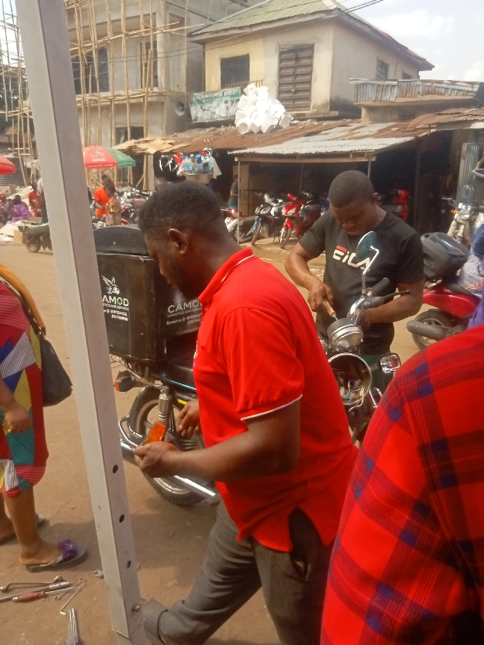 The image captures an outdoor commercial scene, characteristic of a street or market in Nnewi, Nigeria