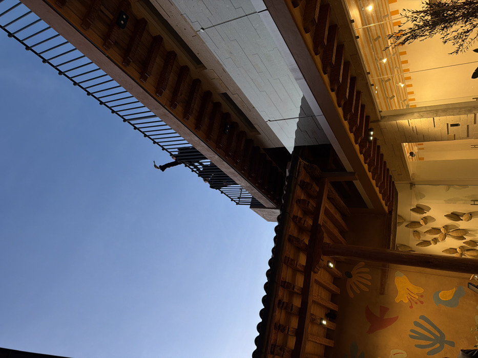 A low-angle shot captures two adjacent buildings against a blue sky. The left building features a dark, brown facade with a metal balcony railing, and a person extends an arm over the railing. The building on the right exhibits a brown wooden structure with dark roof tiles and a wall painted with colorful, abstract floral and avian designs. Above the right building is a brightly lit interior space with decorative elements resembling fish.
