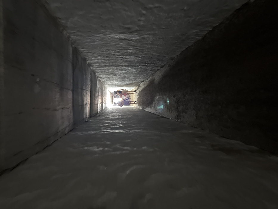 The image depicts the pedestrian tunnel in Reta, Argentina, which connects the town to the beach. The perspective is from within the dimly lit tunnel, looking towards a bright exit. The tunnel features rough, textured light-grey walls and a dark concrete ceiling. The floor is an uneven, dark concrete or dirt path. Three individuals are visible approximately two-thirds of the way down the tunnel, walking towards the bright exit. They are silhouetted against the strong light emanating from the tunnel's end. The leftmost figure wears light attire and appears to carry an item over their shoulder. The other two figures also wear light clothing, with the rightmost figure slightly trailing. A long shadow from these individuals is cast forward onto the tunnel floor, and a small, luminous blue-green artifact is present on the floor in the mid-ground.