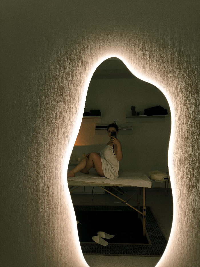 A woman, wrapped in a white towel, sits on a massage table, reflected in a uniquely shaped, backlit mirror