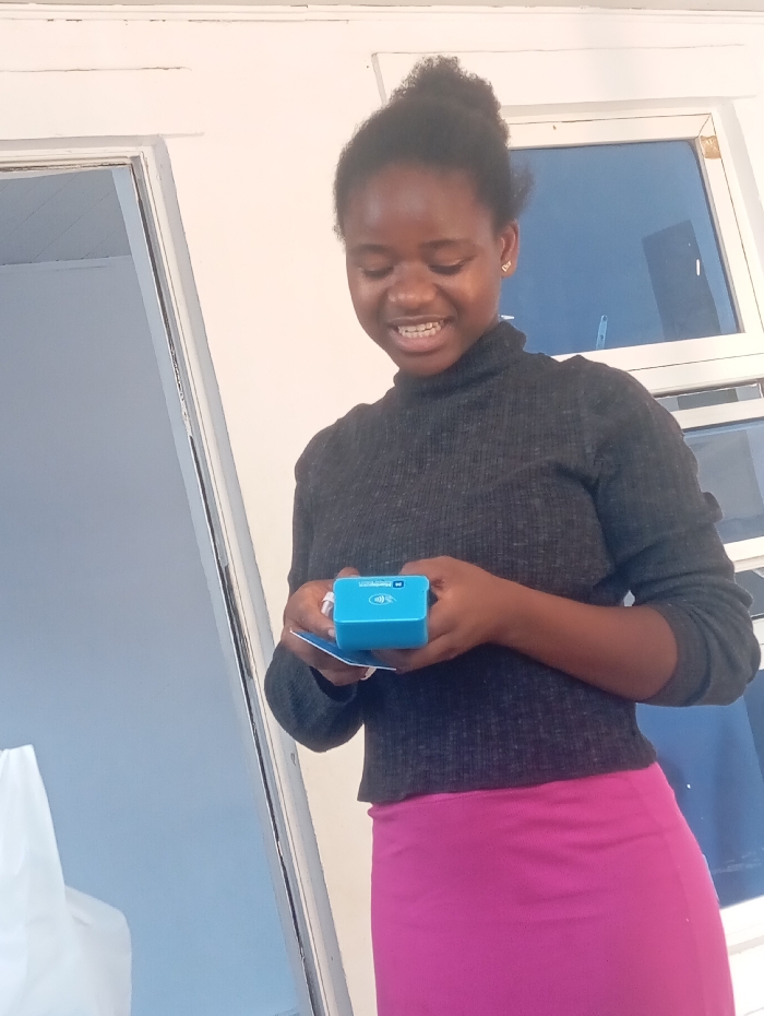 A young, dark-skinned woman in a gray turtleneck and pink skirt holds a small, light blue, square device in her hands, looking down at it with a smile