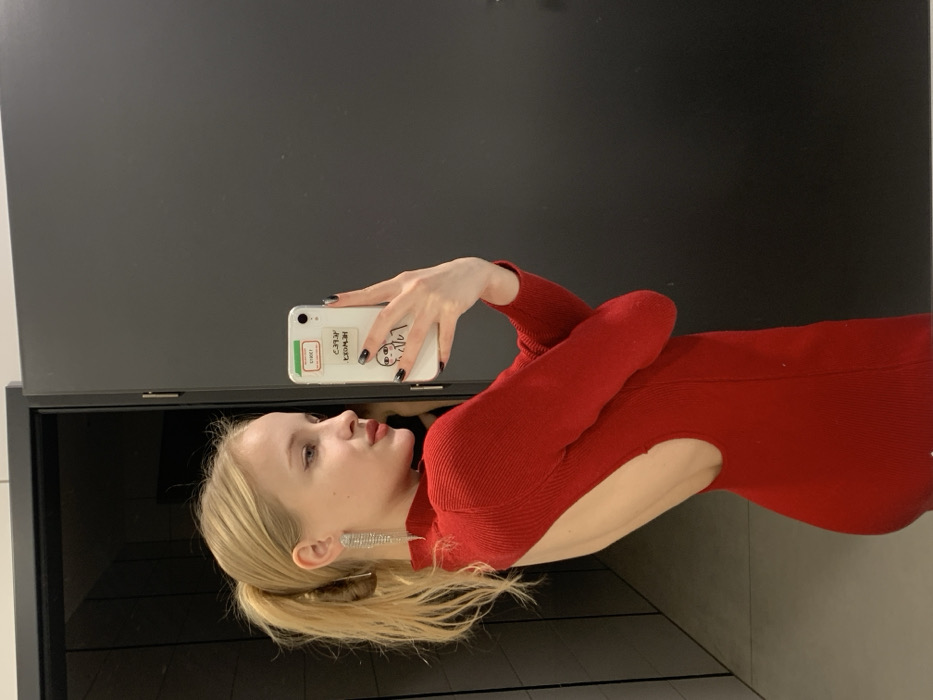 The image depicts a young blonde female taking a mirror selfie indoors. She is positioned in a slight left profile, with her head tilted and lips subtly pursed. Her blonde hair is pulled back into a high ponytail, and she wears a long, multi-strand silver earring on her visible left ear. Her makeup includes red lipstick and dark eyeliner. She is dressed in a long-sleeved, high-necked red knit dress that features a prominent open back cutout. Her left arm is raised, holding a white smartphone with a dark case, angled to capture her reflection. The phone's back is visible, displaying several stickers: a rectangular sticker with a green border and unreadable text, a reversed white sticker with "HEMWORK" text, and a reversed white sticker with a black outline drawing of a figure. Her visible fingernails are painted dark. The background reflects a dark, featureless interior wall or door, suggesting a private or commercial indoor setting. While the image is understood to be from the city of Nowy Targ, Poland, no specific venue or street location within the city is identifiable from the visual content.