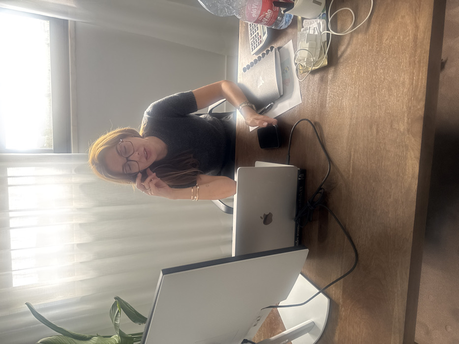 An adult female is seated at a wooden desk in an office or home office setting in Unknown, Unknown