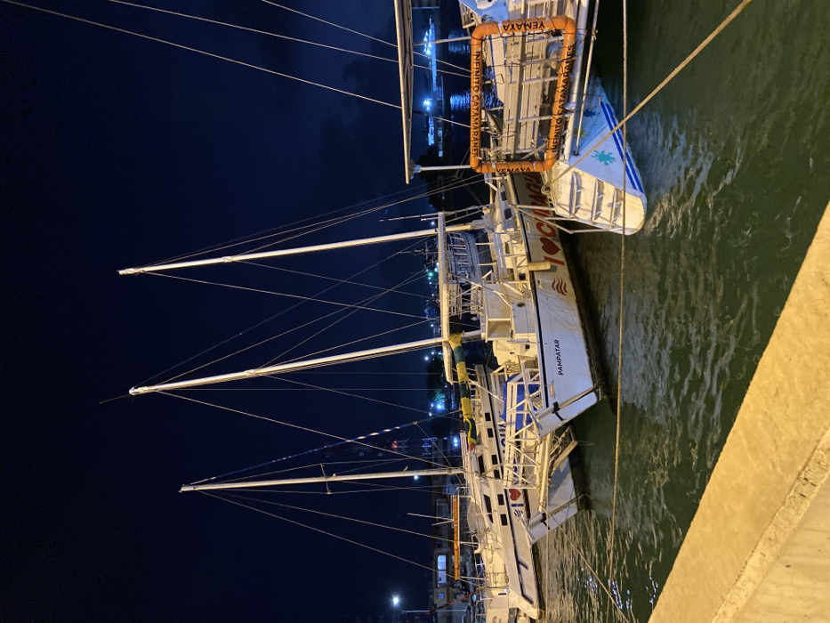 The image depicts a nighttime scene at a marina or dock in Punta de Piedras, Venezuela. Several white catamaran sailboats are moored side-by-side in dark water, illuminated by artificial lights. In the foreground, a concrete dock edge is visible. Mooring lines extend from the boats to the unseen dock. The water exhibits reflections of the artificial lights. The primary subject is a multi-masted white catamaran named "PAMPATAR," clearly visible in the center, with "I ❤️ CAGUIGUA" painted in red on its hull. Its twin hulls are visible, and rigging extends upwards from its two prominent masts against the dark sky. To the right of "PAMPATAR," another white catamaran is partially visible, featuring an orange, net-like barrier with text "INFINITO CATAMARANES" and "YEMAYA" written on it. A white and light-blue painted staircase structure descends from the stern of this catamaran into the water. To the left, a third catamaran, also white and multi-masted, is partially visible. All boats appear to be equipped with furled sails and various deck structures. The sky overhead is dark blue to black, indicative of night. In the background, across the water, distant artificial lights are visible, suggesting a populated coastal area. No individuals are present in the scene, and no active movements or interactions are depicted. The boats are stationary, secured at the dock.