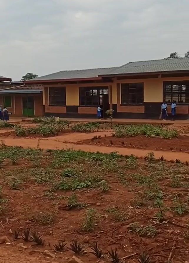 schoolyard with a red dirt ground and a few buildings. The buildings are single-story structures with yellow walls, brick accents, and gray roofs. The camera slowly pans from left to right. In front of the main building are several small patches of vegetation. A few students wearing blue uniforms are visible outside, sweeping the area near the buildings. A water tank is positioned in the middle of the scene between two buildings. The sky is overcast.