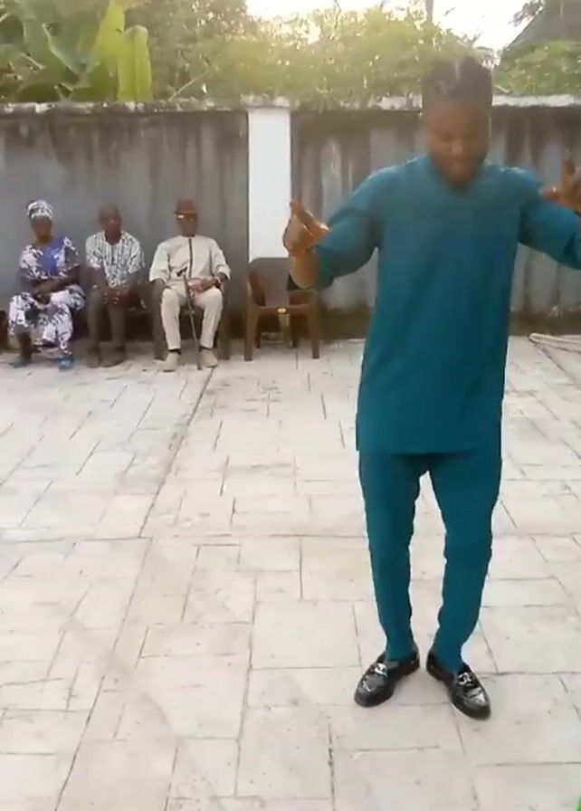 A medium shot shows a young man dancing in front of a grey stone wall. He wears a dark teal suit with black loafers. He has braided hair and a watch on his left wrist. To his left are two elderly men sitting on chairs. One of them holds a walking stick. A blurry figure in a green patterned dress is in the lower right corner of the shot. The ground is paved with grey tiles. There are trees and greenery behind the wall. Sunlight filters through the trees. The scene appears to be outdoors, possibly a backyard.