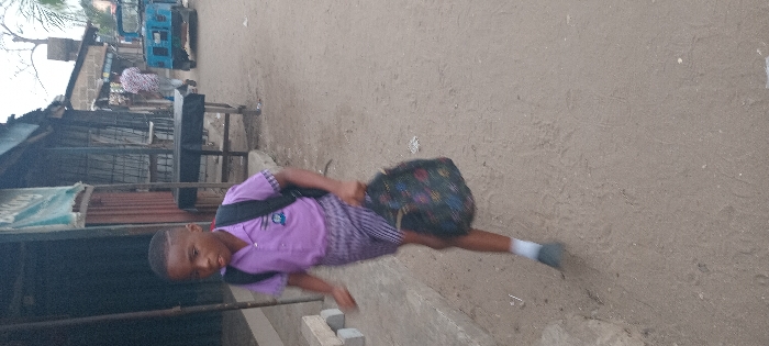 A child in a purple shirt, striped skirt, and backpack is running on a dirt road. The setting appears to be a rural or urban area with simple buildings on the left side. A blue auto rickshaw is visible in the background. The child is positioned in the center of the frame, with a blurred background, suggesting movement. The image is slightly out of focus.