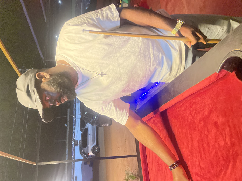 A man wearing a white T-shirt, a silver chain with a cross pendant, and a cap is playing pool on a red pool table. He is holding a pool cue with his right hand and aiming toward the table. He is wearing a gold watch on his left wrist and bracelets on his right wrist. A car and outdoor scenery are visible in the background. Blue lights illuminate the table.