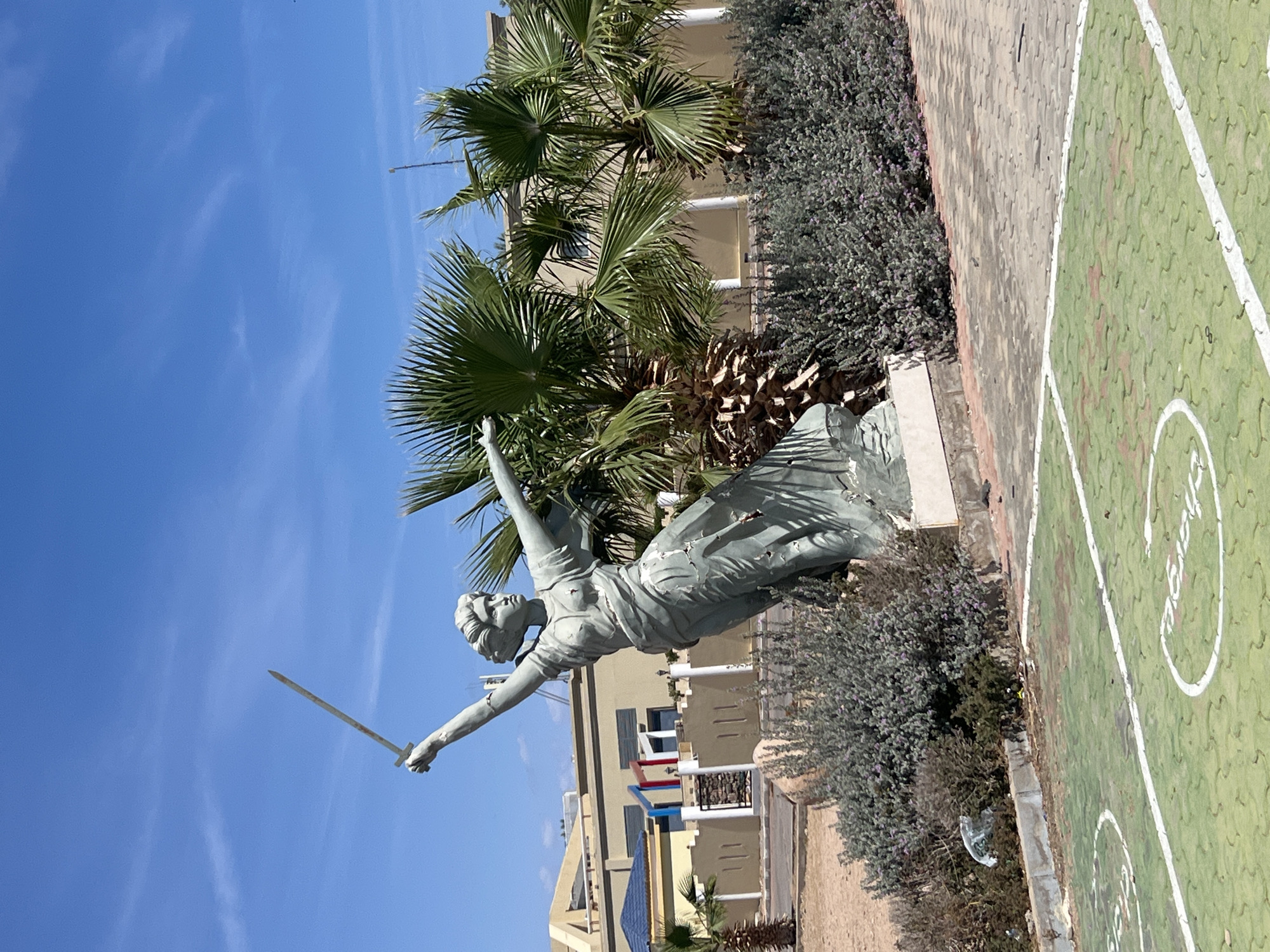 The image displays a weathered grey statue of a female figure in an outdoor setting in Unknown, Egypt, under a clear blue sky with scattered wispy clouds. The statue, depicting a figure in a flowing gown, stands on a low base, leaning forward and to its left. Its right arm is raised high, clutching an upward-pointing, metallic sword exhibiting signs of rust. The left arm is extended outwards, and the figure's head is turned to its right, looking upwards. The gown shows visible damage, including multiple holes and pockmarks, particularly on the lower half. Immediately in the foreground, the ground consists of interlocking green and reddish-brown pavers, marked with white lines forming a partial court or delineated area, including half-circles and straight segments. Partially visible white lettering, likely "Unknown," is present on the green surface. To the left of this paved area, there is sandy earth with low-lying green and purple flowering bushes, among which a crumpled white plastic bag is discarded. Behind the statue are several tall palm trees with large, fanned fronds, and a dense hedge of similar green and purple flowering bushes. In the background, two light tan-colored buildings are visible. The building on the left features a section with a dark blue roof and is partially obscured by a decorative tan wall with vertical slits and a gate, behind which colorful red, blue, and white vertical structures are present. The building on the right has visible pillars and is partially hidden by palm trees. The scene is brightly illuminated by direct sunlight.