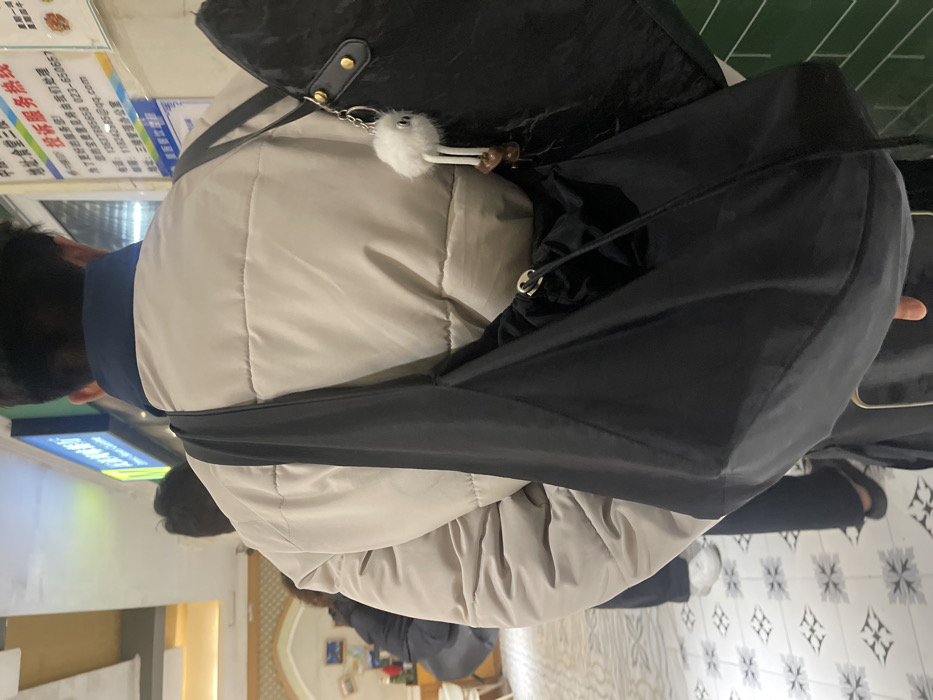 A person wearing a beige puffer jacket with a dark blue collar, is seen from behind, sitting indoors. A black bag with a white fluffy keychain is slung over their shoulder. Visible on the wall is a sign with Chinese characters and service contact information. The background shows part of a room with tiled flooring and a glimpse of another person sitting at a table.