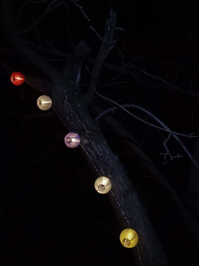 An outdoor scene at night in Plovdiv, Bulgaria, depicts a dark tree trunk and bare branches against a black background. Five illuminated, spherical lanterns are strung diagonally from the upper left to the lower right, draped across or near the tree trunk. From top to bottom, the lanterns are red, cream, light purple, cream, and yellow. Each lantern emits light and appears to be suspended by a thin, faintly visible string or wire. No people or other specific objects are visible. The overall lighting is dim, provided solely by the lanterns, highlighting sections of the tree.