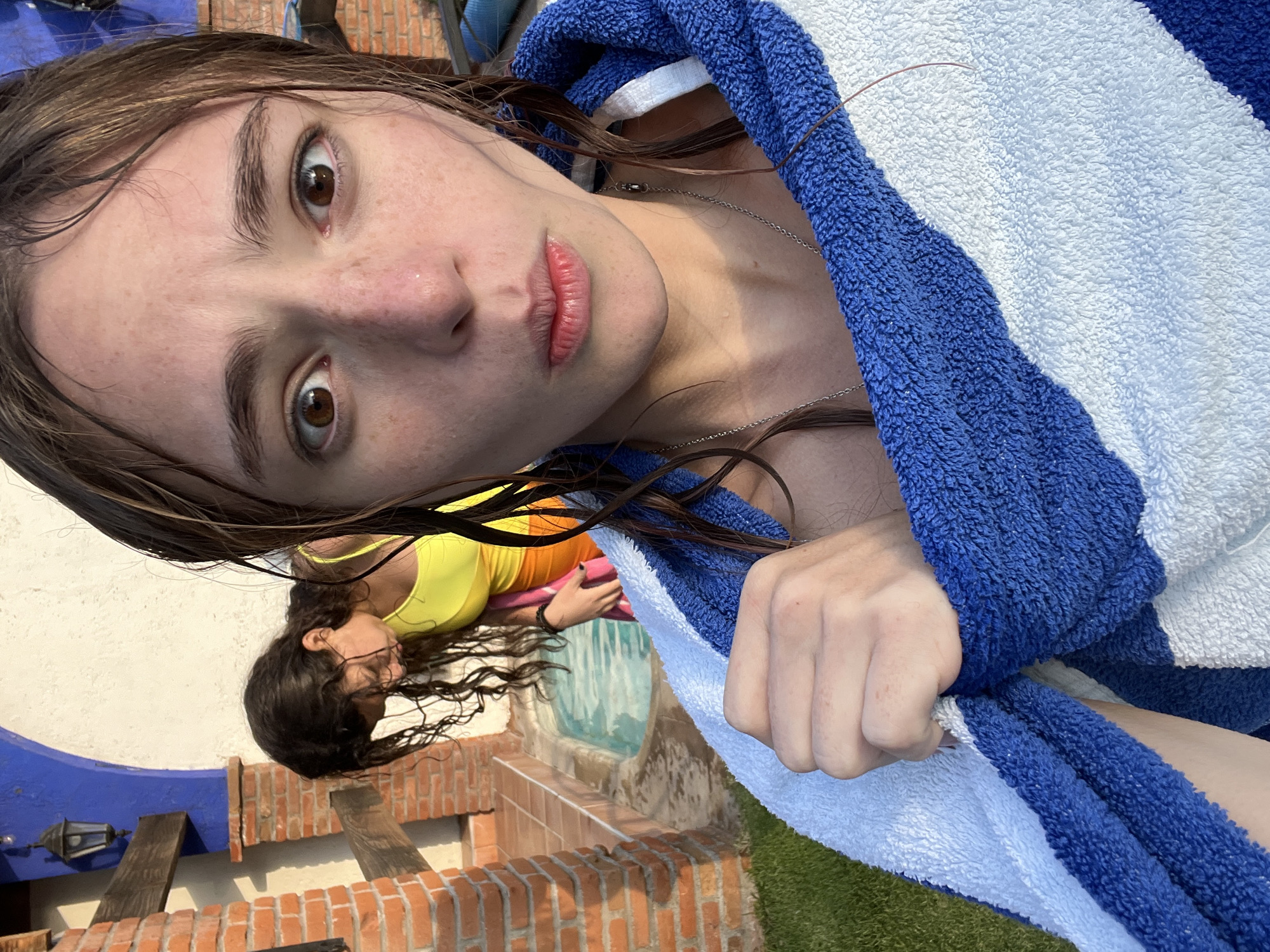 A selfie-style photograph depicts a woman with wet brown hair and a blue and white striped towel draped around her. She has fair skin with freckles, brown eyes, and is wearing a silver necklace. Another woman with dark hair and wearing a yellow top is visible in the background, lying next to a pool. The pool has turquoise water and is surrounded by a brick patio. A blue architectural element and a lantern are also visible in the background. Based on architectural cues, the location is likely Puebla, Mexico.