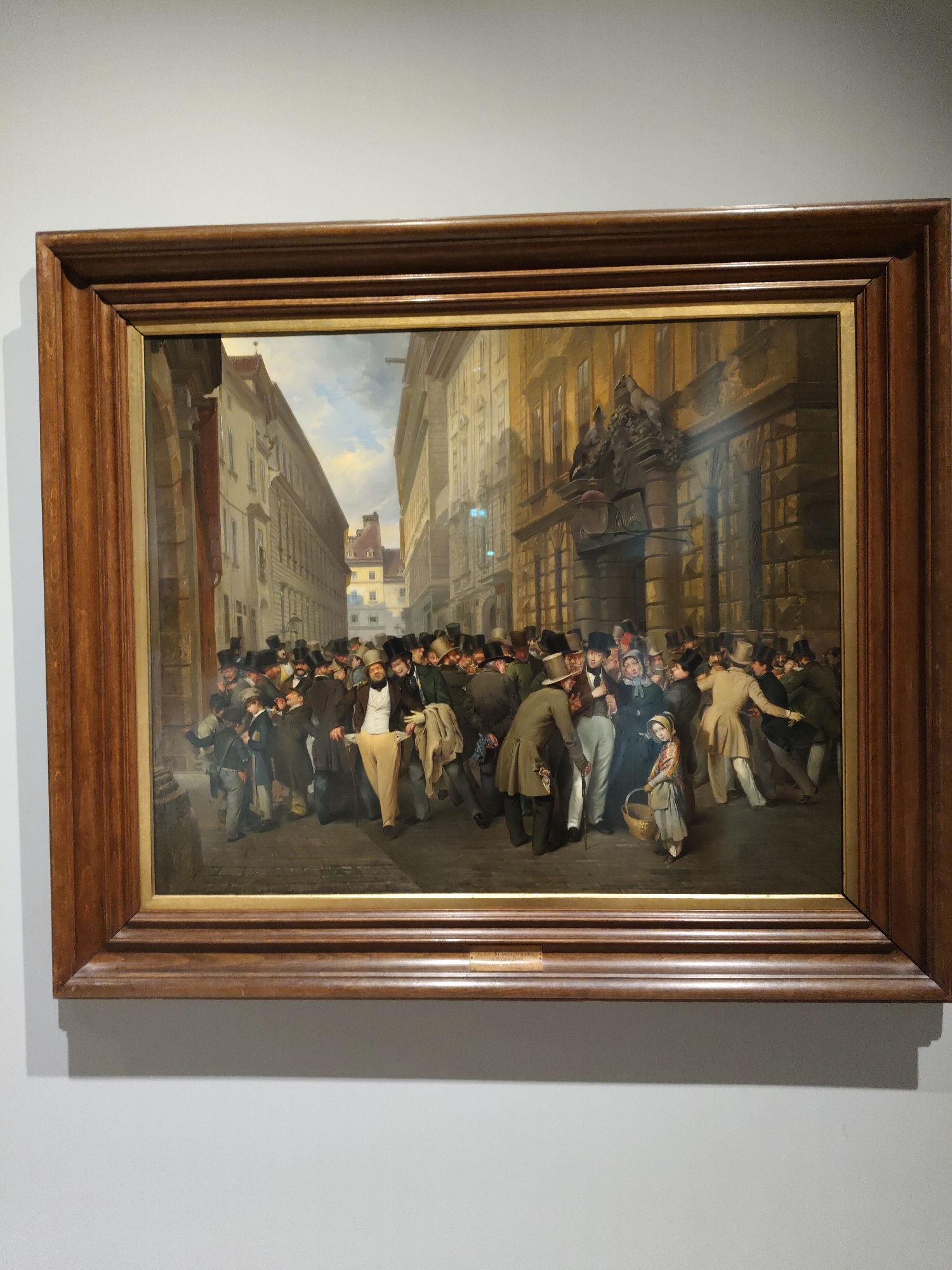 A painting framed in a dark wood frame depicts a crowd of people in a European city, identified as Vienna, Austria. The artwork captures a historical scene with people dressed in early 19th-century attire. Men in top hats and suits fill the street. Some people are running. Buildings line the street with classical architectural details. A child carrying a basket is in the foreground. The scene is lit with natural light.