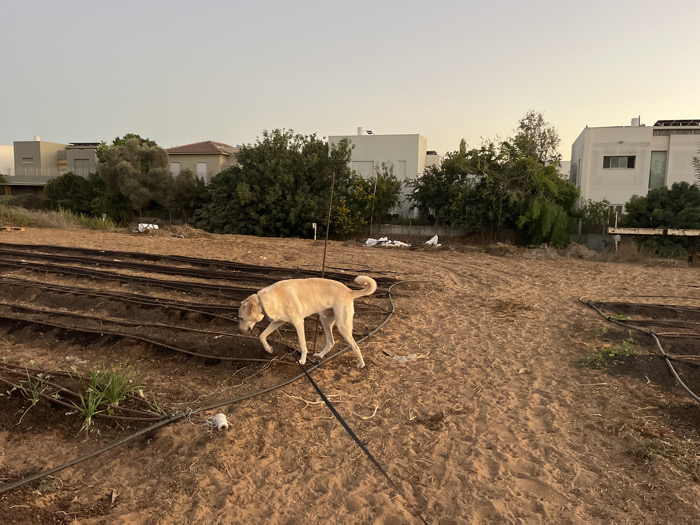 The image displays an outdoor scene in Ein Vered, Israel, under soft, warm light indicative of dawn or dusk. A light-colored dog, consistent with a Labrador Retriever type, is seen walking from left to right across the mid-ground, its head oriented downwards. The immediate foreground and mid-ground are characterized by reddish-brown sandy soil, traversed by several parallel rows of darker, cultivated earth containing black irrigation drip lines. Sparse green vegetation is visible within these rows and among the irrigation lines. A spool of white string or wire rests on the ground in the lower-left quadrant. In the background, a dense line of green trees and shrubs partially conceals multiple modern, light-colored residential buildings, predominantly featuring flat roofs. White debris is visible on the ground behind the trees in the mid-background.