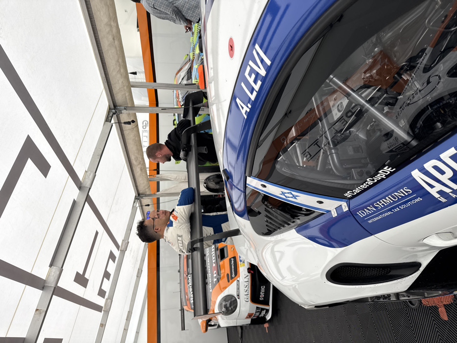 The image depicts an indoor motorsport garage or pit area located in Oberlungwitz, Germany. Four male individuals and three race cars are present. In the foreground, the rear section of a white and blue race car is prominently featured. This vehicle displays "A. LEVI" in white text on the blue trim above the side window and a Star of David emblem on the vertical pillar between the side and rear windows. Below this, a blue stripe contains "#CarreraCupDE" and "IDAN SHMUNIS INTERNATIONAL TAX SOLUTIONS." The car's interior roll cage is visible through its window. Behind this, an orange and white Porsche 911 GT3 Cup car is parked, adorned with sponsor decals including "Haverkon," "Thimin," "GASSAN," and "TAGHeuer." To the far right in the background, a portion of a third race car with a green and multi-colored livery is visible. Among the individuals, a man wearing a white and blue racing suit with "GPELITE" branding, dark hair, and glasses, leans his right arm on the rear spoiler of the foreground white and blue race car. He is looking towards the right. Adjacent to him, a man in a dark shirt is partially visible, appearing to be in conversation with a third man who has short, light-colored hair and a beard, dressed in a black long-sleeved shirt. A fourth man, wearing a plaid shirt, is partially visible from the back on the far right of the frame. The environment includes a white fabric canopy ceiling with visible grey structural supports, and dark, interlocking patterned matting on the floor. Orange and white striped wall panels are visible in the background, indicating a temporary or portable garage structure.