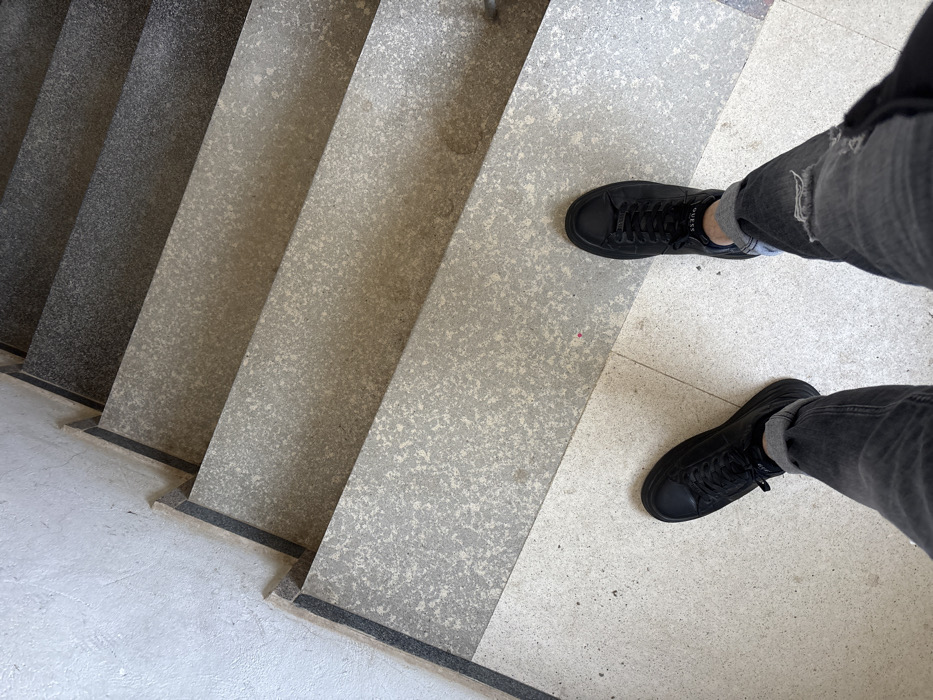 An overhead perspective depicts the lower body of an individual standing on a light-colored, speckled terrazzo landing adjacent to a descending flight of stairs within an indoor stairwell