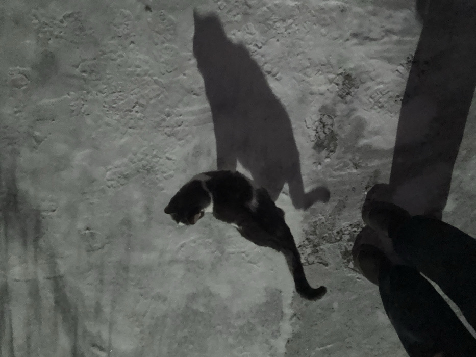 - "An overhead-perspective image depicts a bicolored cat and the lower extremities of a human on snow-covered ground in Ust-Ilimsk, Russia, under low-light conditions" by FM-1eZMB2, licensed under CC BY 4.0