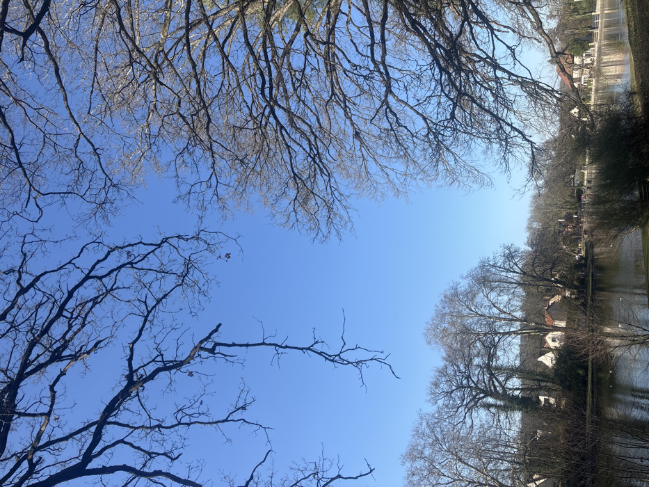 The image displays a panoramic view of the Étang de Saint-Rémy in Saint-Rémy-lès-Chevreuse, France, under a clear, brilliant blue sky. The foreground and upper portions of the frame are occupied by the dark, intricate network of bare branches from several large deciduous trees, strongly silhouetted against the sky, indicating a late autumn or winter season. The Étang itself constitutes the middle ground, its surface reflecting the bright blue sky and partial reflections of the surrounding landscape. Multiple small, white waterfowl are scattered across the water. Along the far bank of the pond, a line of residential structures, characterized by light-colored facades and reddish-brown tiled roofs, is visible, interspersed with numerous leafless trees and some sparse evergreen foliage. The near bank features additional bare trees and low-lying bushes on the right side. No human subjects are present in the scene. The overall illumination suggests natural daylight, likely a sunny morning or afternoon.