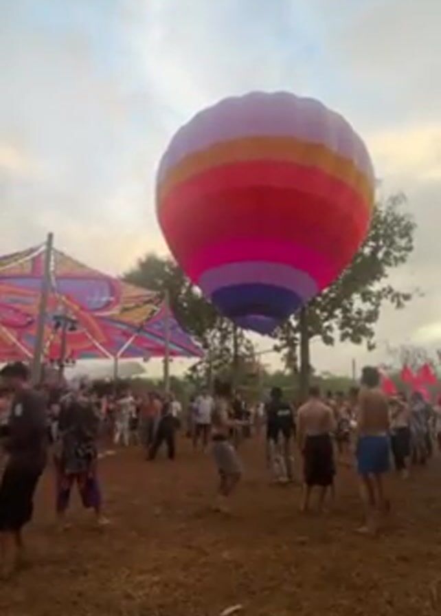 festival with music, dancing, and a large, stationary, striped hot air balloon. There are many people present, some of whom are shirtless. The ground is brown and possibly muddy. There's a colorful fabric structure on the left side of the frame. The sky is partially cloudy.