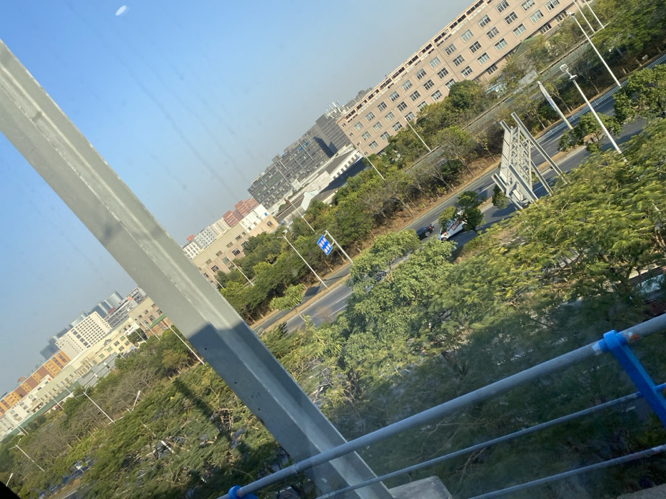 The image displays an elevated view of an urban landscape in Shunde District, China, captured with a pronounced counter-clockwise tilt. In the immediate foreground, a substantial grey structural beam, possibly from an overpass or elevated platform, runs diagonally across the frame, accompanied by grey metal railings that exhibit blue accents on the lower left. The midground is dominated by a multi-lane asphalt road, which appears to traverse diagonally from the lower left to the upper right due to the camera's orientation. This road is flanked by extensive green vegetation, consisting of numerous trees and shrubs forming a dense roadside environment. Multiple tall, slender streetlights are positioned along the road's edge. Two vehicles are discernible on the road: a dark-colored passenger car and a white utility truck. A blue rectangular traffic sign with white directional symbols is visible on the right side of the road, and an overhead grey gantry structure, typically used for signage, spans the road further in the distance. The background features a dense collection of multi-story buildings, indicating a developed urban or industrial area. A prominent light-brown building with multiple rectangular windows occupies the right side of the background. Taller, more modern buildings are visible further in the distance. The upper portion of the scene reveals a clear blue sky. The entire environment is illuminated by bright daylight, casting discernible shadows from structures and vegetation. No individuals are clearly discernible within the frame.