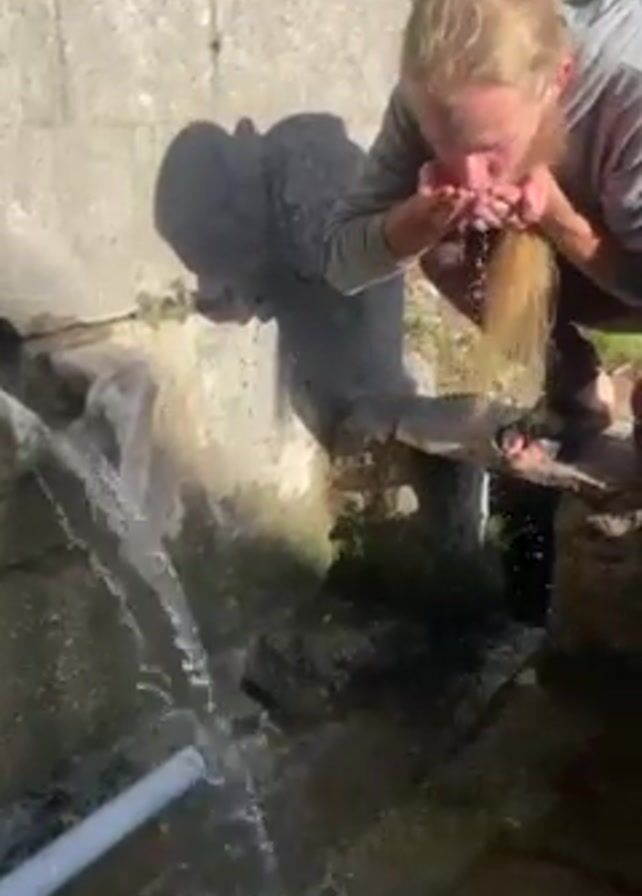 A man with long blonde hair and a beard is crouching by a natural spring. He is wearing a grey hoodie and sandals. He scoops up the water with his hands and drinks from it, repeating the action. A pipe is visible where the water is channeled into a small pool. The backdrop consists of a mossy stone wall with some foliage and sunlight visible behind.