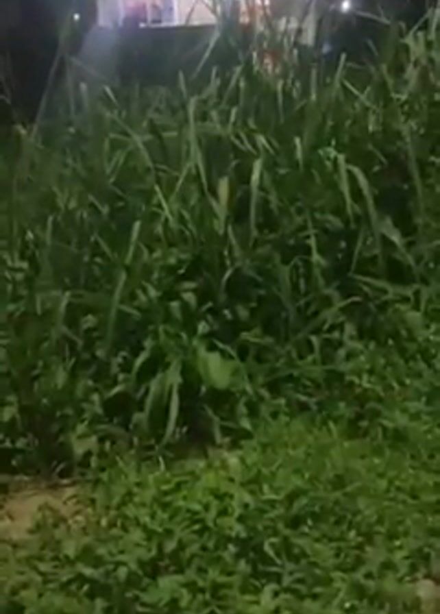 n outdoor scene at night. The foreground is dominated by overgrown vegetation, with tall grasses and lower-lying ground cover. A concrete sidewalk or path is visible at the bottom of the frame. In the background, a two-story building is illuminated by lights, giving it a brighter appearance compared to its dark surroundings. A tall, blue, cylindrical structure, possibly a signpost, is partially visible on the left edge of the frame, interrupting the view. The overall environment suggests a residential area with unkempt landscaping.