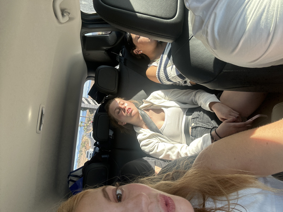 Three young women are in a car. Two are reclined asleep in the back seats. The first has dark hair and a striped shirt. The second has lighter hair, a white tank top, and a white jacket. She is wearing a seatbelt and holding a phone. The third woman, who seems to be taking a selfie, has long reddish-blonde hair and is wearing a blue shirt. The view out the window shows a sunny coastline.