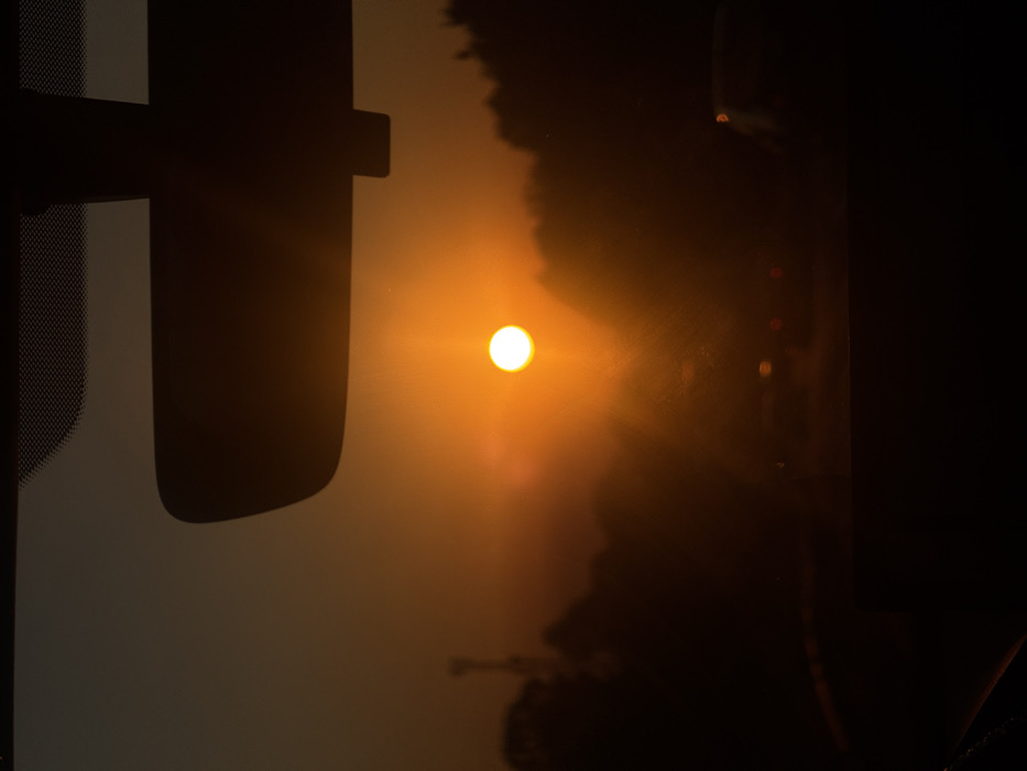 The image displays a dusk or dawn scene viewed from the interior of a vehicle, looking forward through the windshield, situated in the city of El Pipirín, Mexico. The central feature is the sun, appearing as a brilliant orange, circular orb with a distinct starburst effect, positioned in the upper-middle of the frame. The sky surrounding the sun transitions from a luminous orange to a darker, muted grey-brown towards the top. Within the vehicle's interior, a dark, silhouetted rearview mirror is prominent in the upper-center, partially obscuring the sky. Above the mirror, a textured headliner or ceiling component is visible. The lower section of the image shows the dark, undefined edge of the vehicle's dashboard. The windshield glass exhibits minor smudges or dust particles, discernible against the intense backlight of the sun. Externally, the landscape is presented in silhouette. Dense, dark foliage or trees line the horizon on both the left and right sides of the frame. Behind the left-side foliage, a tall, slender, light-colored structure, consistent with a utility pole or antenna tower, is faintly visible. In the mid-ground, on what appears to be a roadway, multiple vehicle silhouettes are present, indicated by blurred red and white lights, suggesting active traffic. No individuals are visible within the scene. The overall atmospheric conditions appear hazy or dusty, contributing to the diffused light effect.