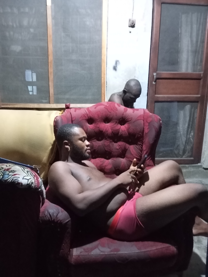 A dark-skinned man lounges on a dark red armchair in a dimly lit room. He wears red underwear and no shirt, looking at his phone. Behind the armchair, another dark-skinned man, also shirtless, stands near a doorway. The room also contains a window with a screen.
